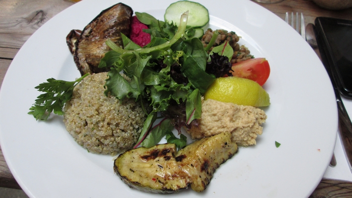 Restaurant review #21 – Chances are you’ve probably been in one of the many establishments worldwide of Le Pain Quotidien. Or at least you’ve seen one of them! There is also one in the heart of Bruges, near the central market place and the Burg. Pain Quotidien is French for Daily Bread. They sell a wide variety of bread over the counter, and you can also sit down for breakfast, lunch or just a coffee with some baked goodies. The restaurant always has one large communal table (for 10 people or more), but also other tables for 2 if you want to have a more private conversation. There’s always something vegan available and vegan items are clearly marked on the menu card. Le Pain Quotidien confirmed to us that the bread served at the table is always vegan. Most of the breads sold over the counter are also vegan, but the raisin bread (kramiek), sugar bread and brioche are non-vegan. UPDATE – see below We were at Le Pain Quotidien in Bruges for lunch on a Friday, and the …