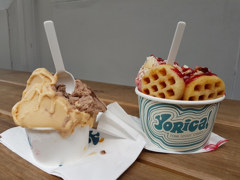 shop review#38 – Yorica is a vegan icecream shop in London. There are two locations, one in Notting Hill, and one in Soho. Upon our arrival in London this Summer for a short city trip, the one in Soho was our first stop, as it was just around the corner from where we stayed! All the products sold at Yorica are not only vegan, but also free from nuts and gluten. You can buy icecream, waffles and pancakes to take away, or to eat at Yorica’s itself, although there is not that much space inside (some bar stools inside and a bench in front of the shop). One orders at the counter and the order is immediately delivered. After the order is handed to you, you can add some sprinkles on top if you wish. We were a bit overwhelmed by all the possibilities on the menu (not being used to having that many options 😉 : several flavours of icecream, frozen ‘yoghurt’, waffles, and pancakes. There was some queuing up to the counter, but …