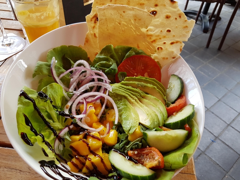 restaurant review #191 – Valkenburg is a small town in the south of the Netherlands, near the Belgian border. We were here a couple of weeks ago, and also visited several restaurants in Maastricht at the time. The city center of Valkenburg is very touristic. Valkenburg is well known among cycling fans, as it is the place where the Amstel Gold race finishes. De ‘Grote Straat’ (the main street) is one restaurant next to the other, with all more or less the same – very traditional – menus (‘seafood, steak, lobsters, etc …). Very disappointing đ Also spotted this sign in one of the tourist shops). Beforehand, we had found references of two other places in Valkenburg with vegan options (El Castillo, and Eten bij Ziza), but both are closed for lunch. We suddenly saw a sign at the wall of a restaurant with ‘vegan wine’ written on it, so that was a pleasant surprise. We asked the waitress if they had any vegan options on the menu, and they have one: a salad with …