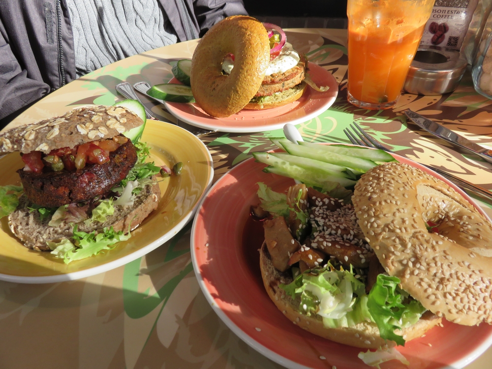 Restaurant review #61 – We were in Utrecht for the vegan festival VegfestNL (see our review here), and the day afterwards, we went for lunch to Bagels & Beans in the city center. Utrecht is not that far from Bruges, only about 220 km. Bagels & Beans is a chain with several locations throughout the Netherlands. There’s always something vegan available, and on our visits staff has always been very friendly to check for ingredients (see previous review of Bagles & Beans in Alkmaar). Since mid October 2015, they also have two vegan burgers standardly available: the Dutch Weedburger and the Chili burger from Just like your mom. Yeah! The burgers do not come in a burger bun though, but in a bagel – of course! (there are about five bagels to choose from). The weather was exceptionally mild for a Fall day, and we choose to sit outside on the terrace, which was quite nice. The Bagels & Beans in thye city center of Utrecht is located on a nice quiet square, close to the music …
