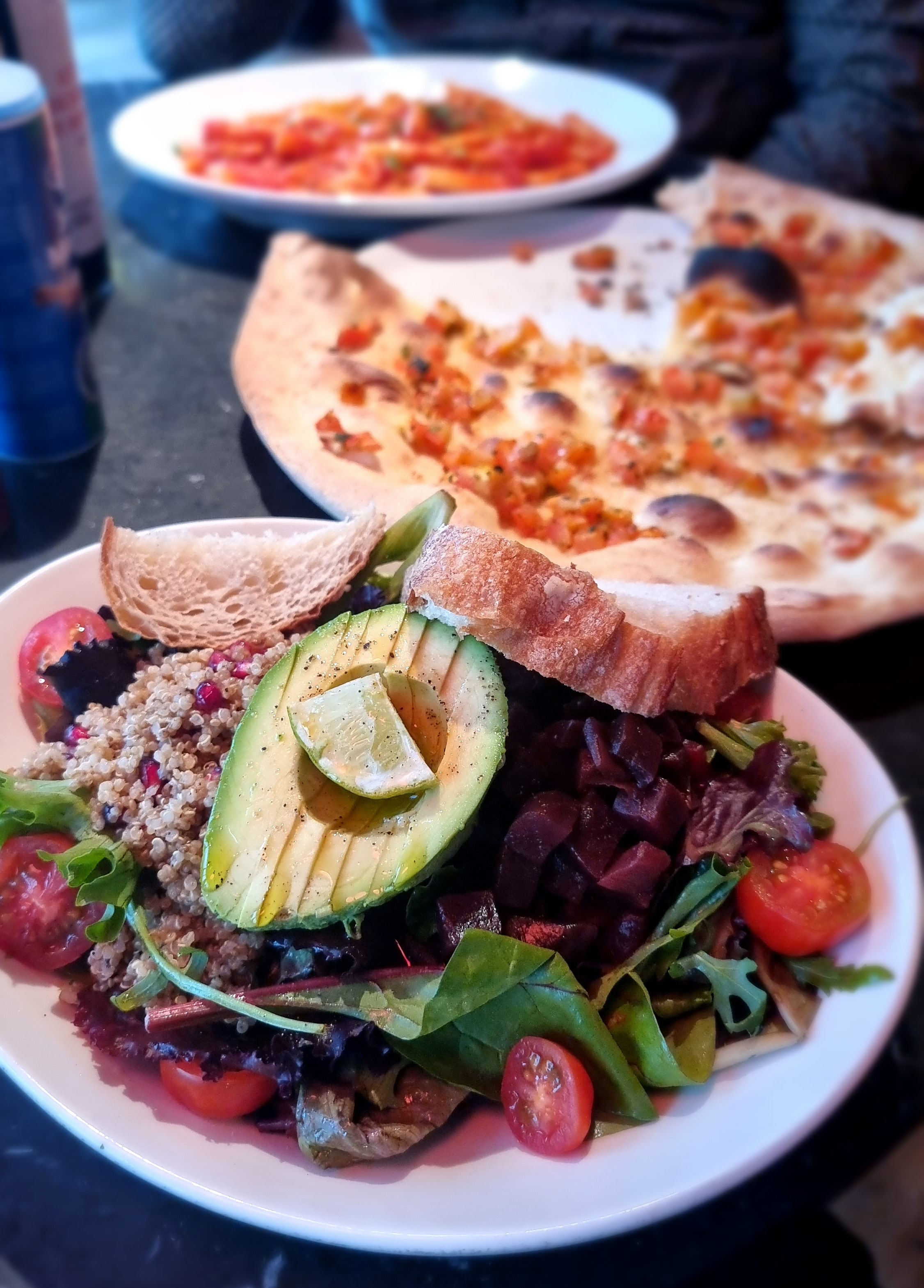 restaurant review #458 – Vegan pizza restaurant !! 🍕🍕🍕 This place is in the touristy city center, so quite busy. Not very big. We had made a reservation – all tables were occupied, still seatings available though at the high bar stools in front area. Lots of choice on the menu!!We had the ‘you bac*n me crazy’ and ‘the garden’. Both 14,95€ (reasonably priced, given the location). It took quite a while before our order was taken and the pizzas were served. Staff spoke English, no Dutch. Decent size pizzas. The center bottom of the crust was quite soggy though, so you couldn’t eat a piece by hand, not firm enough. ‘The garden’ was ok, the ‘bacon’ pizza monotone. 😐 And the virgin mojito was also more water/ice than flavour… So all in all: had higher expectations. Wouldn’t really go back. Of course great to have an all vegan pizza restaurant, but could be way better. Not accessible: step to get in. Front area of restaurant is with some high bar chairs, back area with …